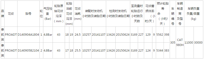 2015年6月,泰凯英工程师走访了山东某大型散货码头客户,实地考查了新开发的装载机专用轮胎的使用表现,经过专业的测量和科学的对比,证实泰凯英PROADT系列装载机专用胎表现优异,详细数据如下: